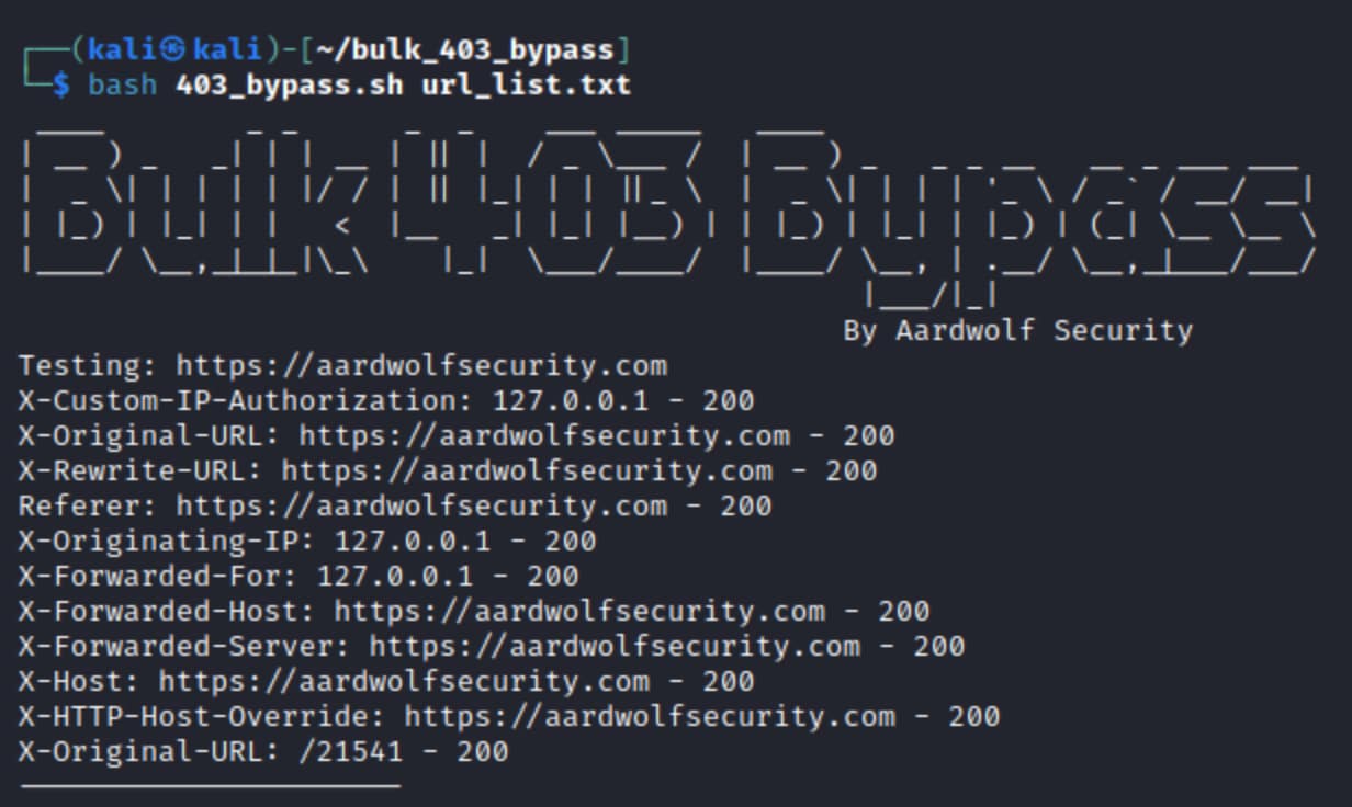 Once the Aardwolf Security team confirmed that these pages were indeed providing the correct 403 error, they then had to test whether the 403 could be bypassed. However, publicly available tools on GitHub only allowed for individual URLs to be assessed. It was not practical to test each URL individually as there were over a hundred different web applications to test. Therefore, the Aardwolf Security team had to create a tool that would allow for a user to input a list of URLs, which would then each be tested using well-known 403 bypass methods.